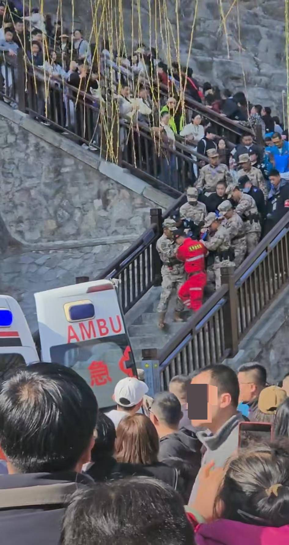 网传视频显示,景区山边较窄的石阶上,挤满了人。多名救援人员抬着担架,往台阶下移动。地面停着一辆救护车,车门打开。