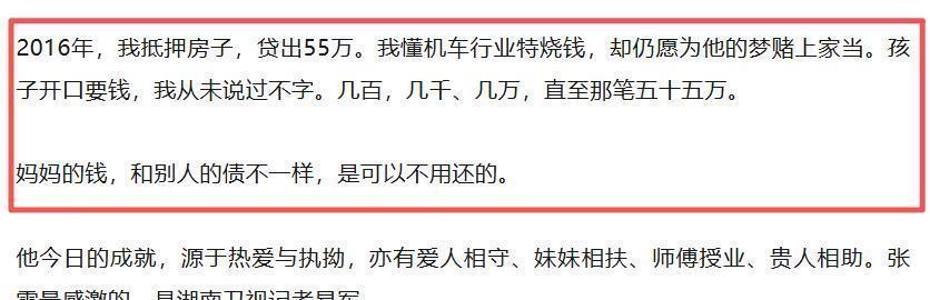图源:小雷截图张雪创业的时候,何琼直接倾其所有,2016年抵押了自己的房子,贷出55万给儿子做启动资金,还悄悄补了5万。