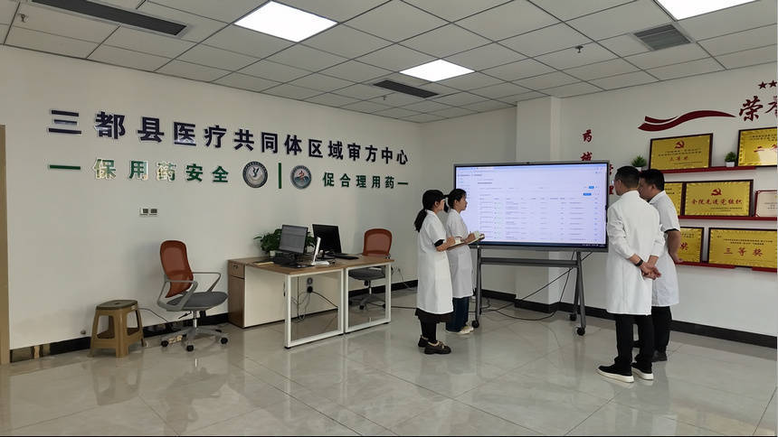 信息化平台是支撑全流程高效运转的核心。系统集成了目录管理、采购协同、库存查询、处方流转与用药监管等功能,实现了药品从采购到使用的全流程追溯。特别值得一提的是,依托该平台建立的医共体审方中心,创新采用了“系统智能审核 + 药师专业把关”的双轮驱动前置审方模式。“处方先由系统自动审核,发现问题则交由临床医生和药师进行人工复核。如果仍有疑问,还能通过远程会诊系统进行面对面沟通,最终确保每张处方都合理、有效、经济。”三都县人民医院(医共体)总院药械服务管理中心副主任何胜虎解释道。