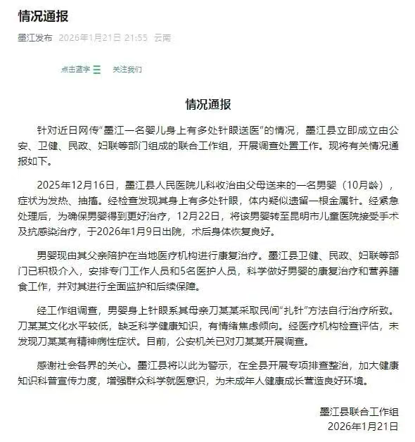 2025年12月16日,墨江县人民医院儿科收治由父母送来的一名男婴(10月龄),症状为发热、抽搐。经检查发现其身上有多处针眼,体内疑似遗留一根金属针。经紧急处理后,为确保男婴得到更好治疗,12月22日,将该男婴转至昆明市儿童医院接受手术及抗感染治疗,于2026年1月9日出院,术后身体恢复良好。