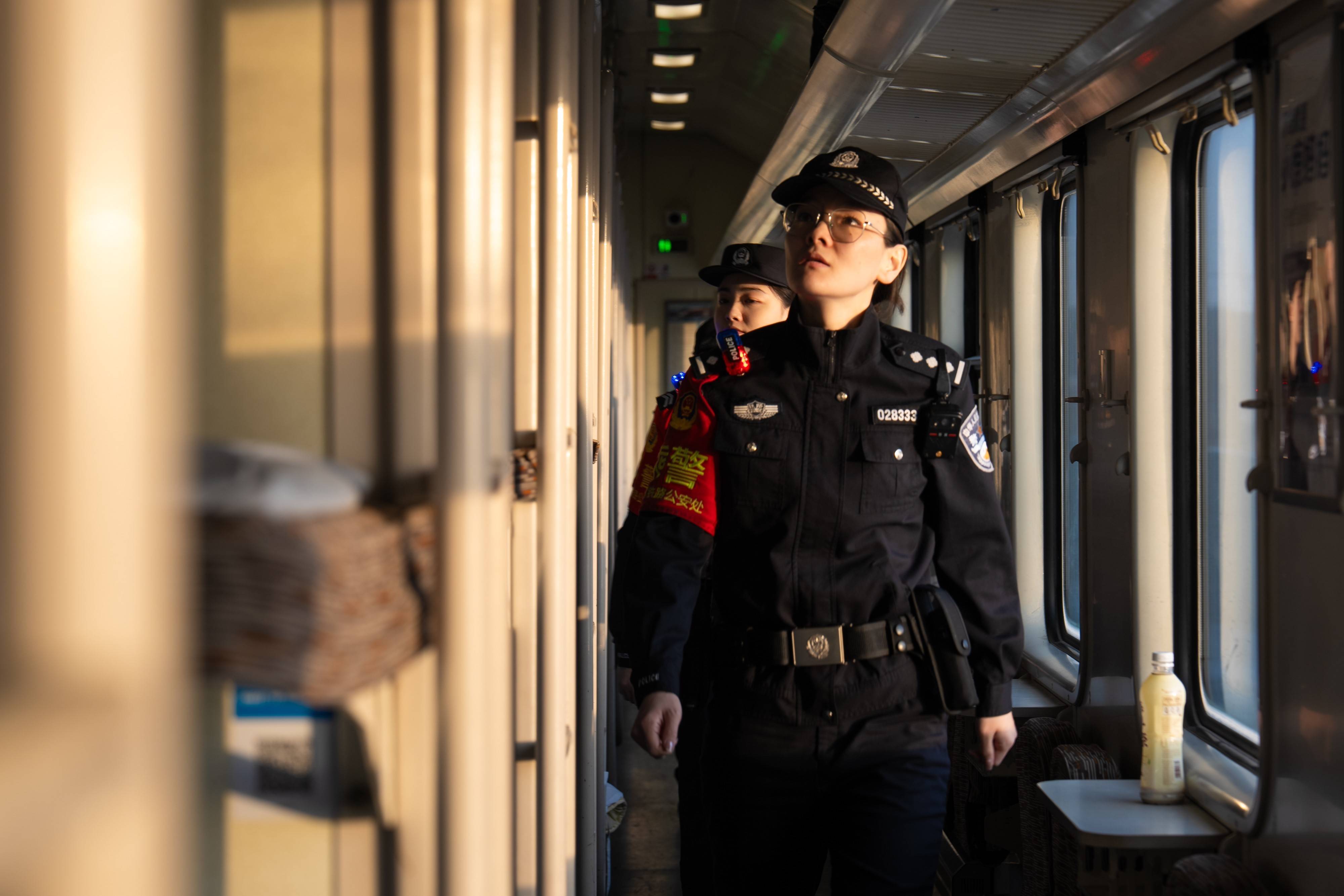 在列车上,乘警们会定时巡逻,排查安全隐患。新华社发(杨晓玲 摄)在重启后的列车上,海拉尔铁路公安处“艾音卓拉乘警组”全程护航,他们会在巡逻中排查安全隐患,重点帮扶老年旅客与儿童,针对冬季雪原运行特点制定专项预案。