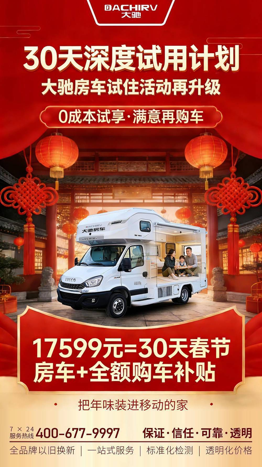 这个新春,大驰房车重磅推出「马年新春・30 天深度试用计划」,以 “0 成本试享、全流程无忧、高价值回报” 为核心,让你带着团圆出发,解锁游牧式过年新体验!