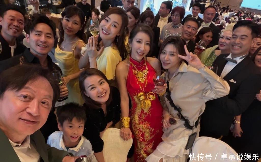 接着,陈婉衡换上了一件红色的中式礼服,挂颈露肩的设计也挺有看头,特别是满满的金器装扮。她的金器行头相当夸张,脖子上至少挂了三对“流星锤”龙凤镯,手上还戴着三对龙凤镯,另外金猪金链也是亮瞎了眼,贵气十足。姐妹团这边,有TVB的一帮好姐妹,比如朱智贤、简淑儿、蔡佩贤啥的,她们都穿着一模一样的香槟金长裙,优雅地围在身边。参加的宾客也不少TVB的老同事,比如《3日2夜》的监制张志明、黄颖君啥的,都来了。